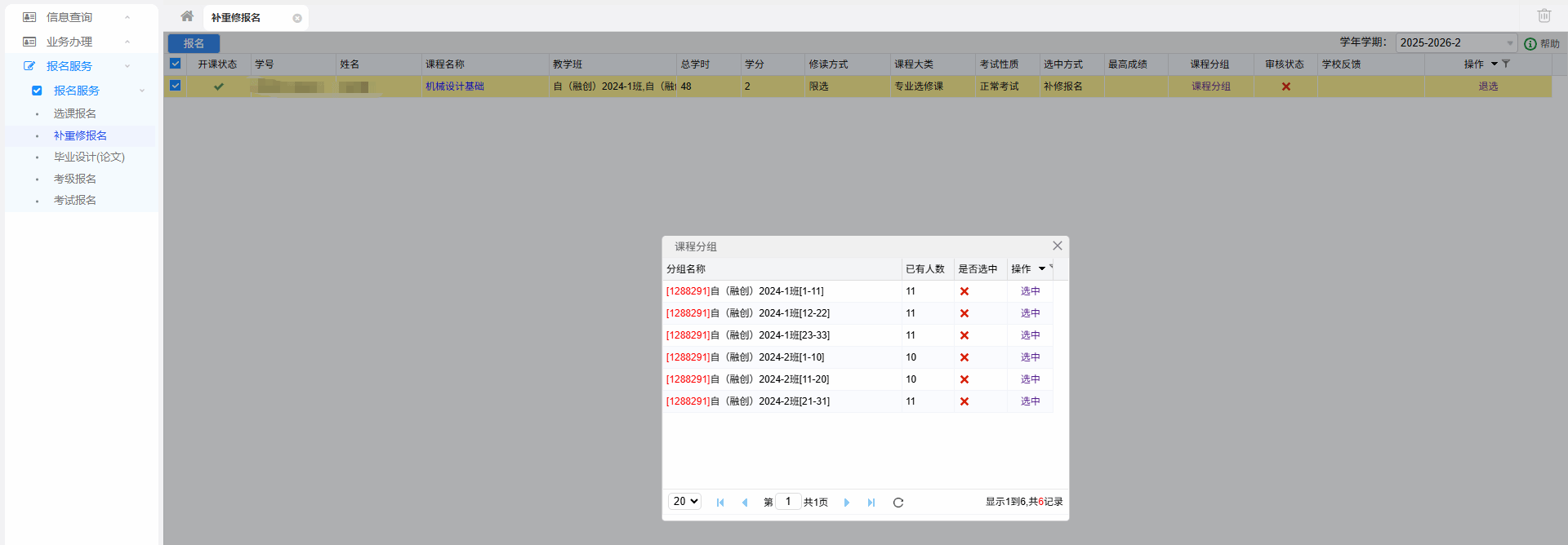 8.若申请补修的课程含分组,点击“课程分组”选择想报名加入的分组,逾期不予补选。