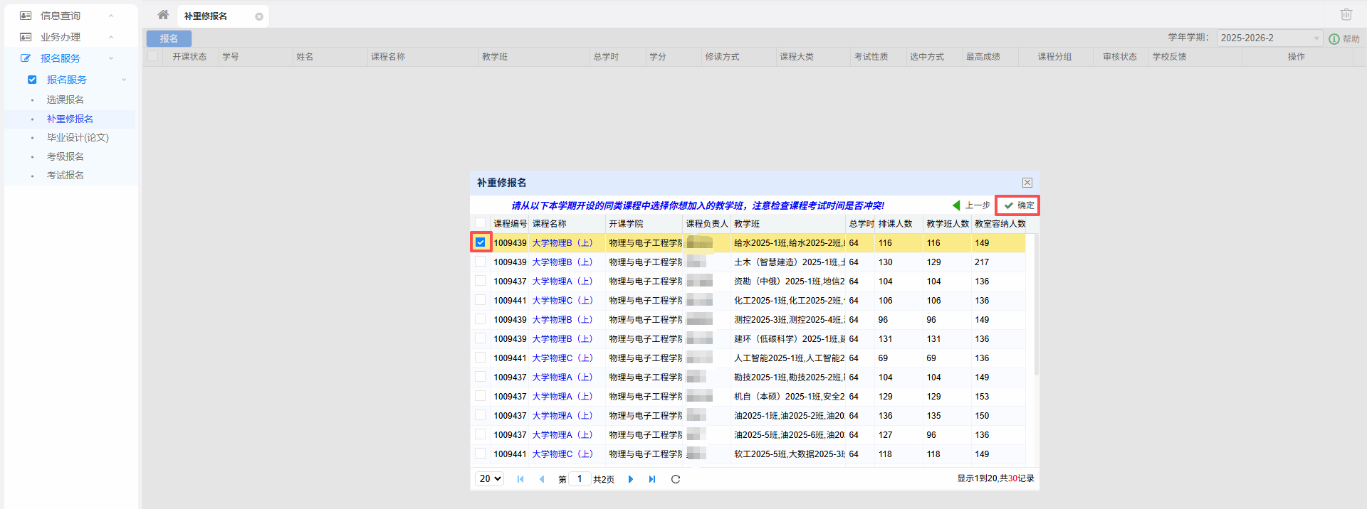 5.学生确认好补修课程的上课时间满足个人需求后再勾选想报名加入的教学班,然后再点击“确定”按钮,即可报名成功。(如下图)