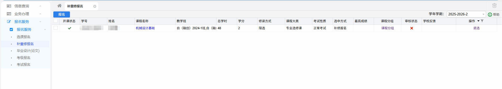 7.申请操作成功后静待审核,在补修申请审核通过之前允许退选,审核通过后不可退选,退选操作直接点击“退选”即可