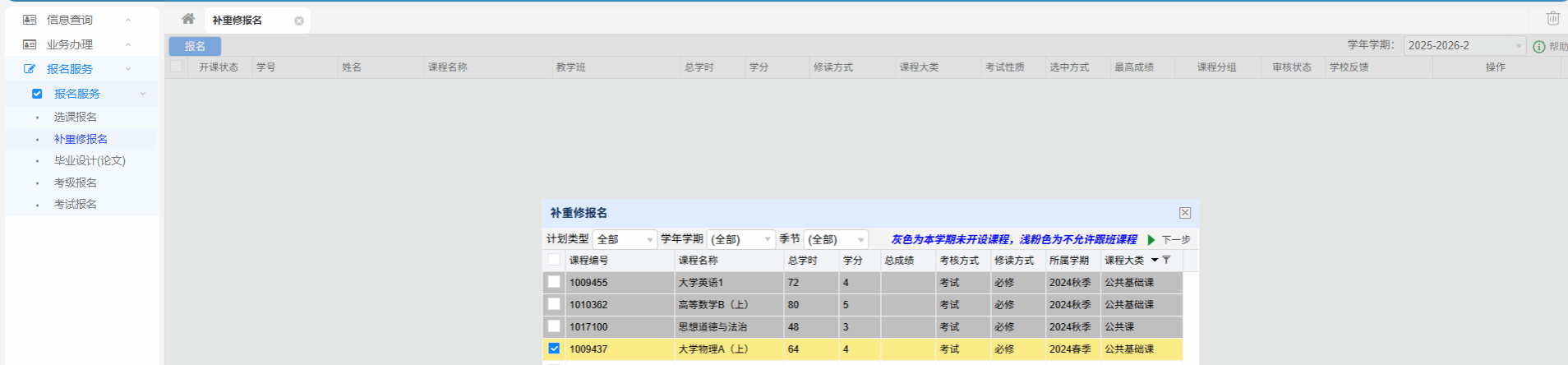 2.点击“报名服务”—“补重修报名”,学年学期选择“2025-2026-2”,点击“报名”(如下图)